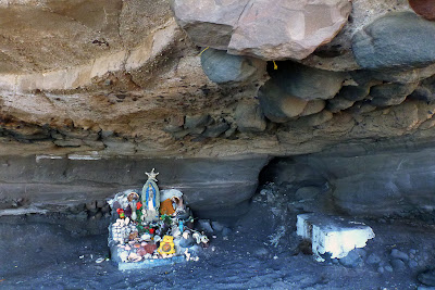 Inside the cave was an altar to the Virgin, plus some thousands of large boulders in the roof, hopefully firmly cemented by the volcanic ash in which they were embedded—but they looked like they could come crashing down at any moment.